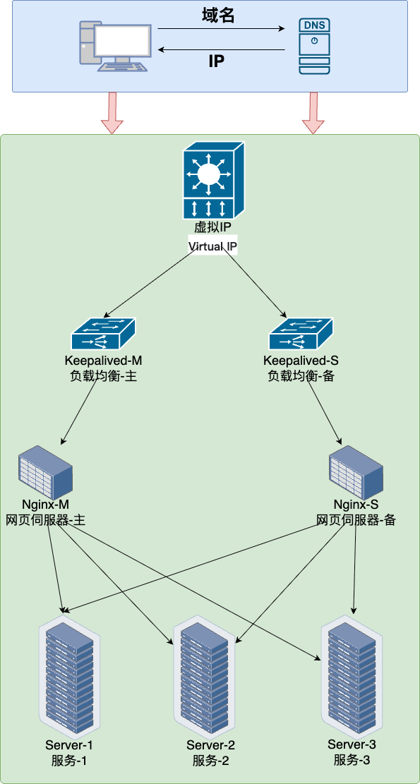 2.通过该虚拟IP访问到对应的负载均衡器(Nginx),这里Nginx部署两个,然后通过Keepalived来保证NG的高可用,正常情况下由Keepalived-M将虚拟IP映射转发至Nginx-M,如果Nginx-M出现故障,此时Keepalived会切换至Keepalived-S开始工作,从而保证了NG的单点故障问题。