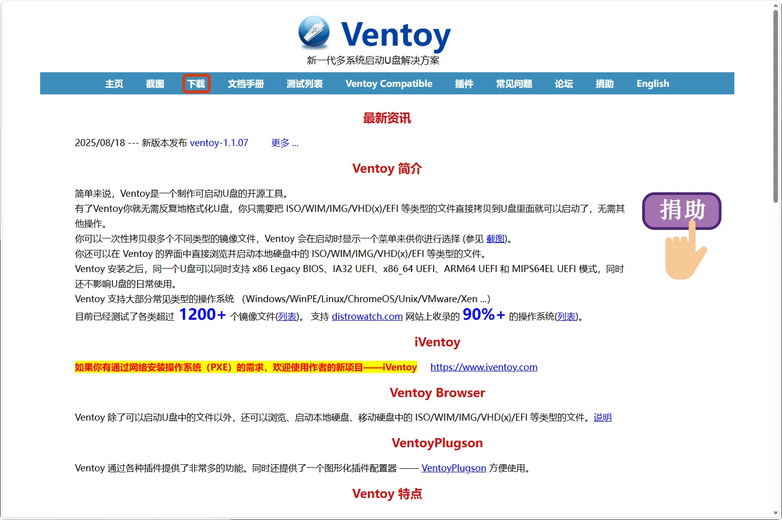 本教程采用Ventoy工具制作Windows系统安装启动盘。Ventoy是一款开源的启动U盘制作工具,支持直接拷贝ISO文件到U盘而无需格式化。首先访问Ventoy官方网站:https://www.ventoy.net/cn/,点击页面上的”下载”按钮