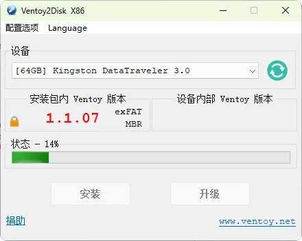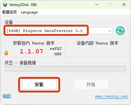 在Ventoy主界面中,确认选择正确的U盘设备(请仔细核对,避免选择错误的存储设备),然后点击”安装”按钮