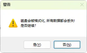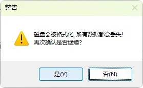 系统会弹出警告提示:制作启动盘将对U盘进行格式化,所有现有数据将被清除。请确保已备份U盘中的重要数据,确认无误后点击”是”继续操作