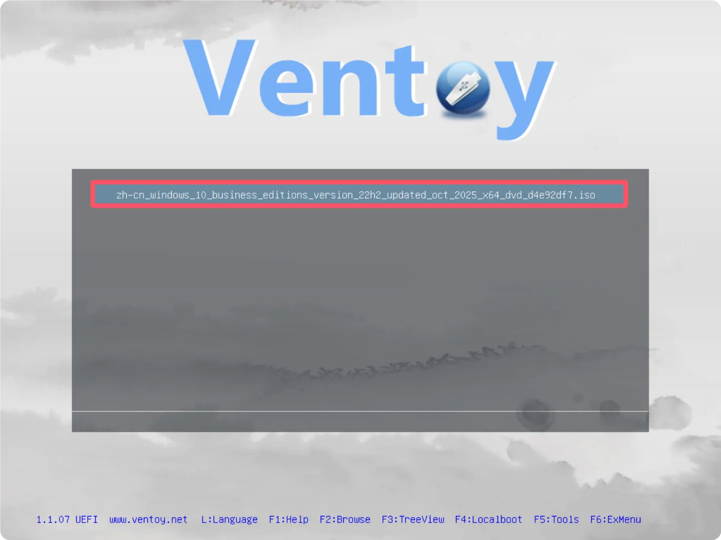 成功进入Ventoy启动界面后,使用方向键选择您之前复制到U盘中的Windows系统ISO镜像文件,然后按回车键确认