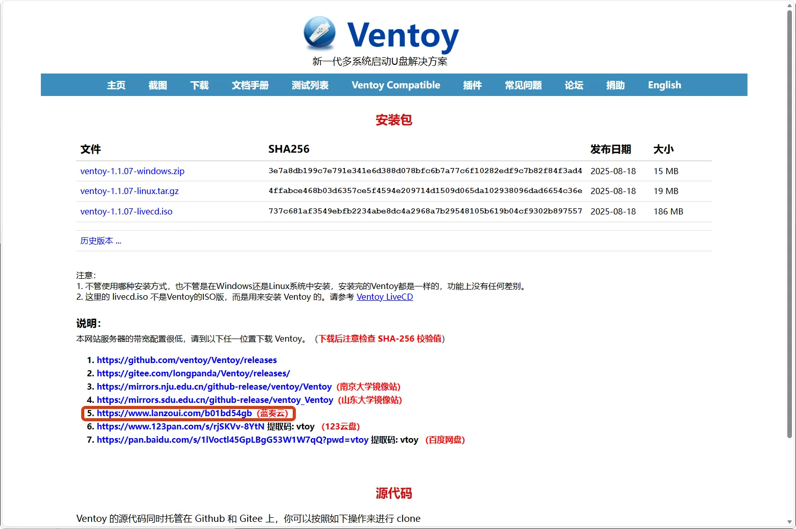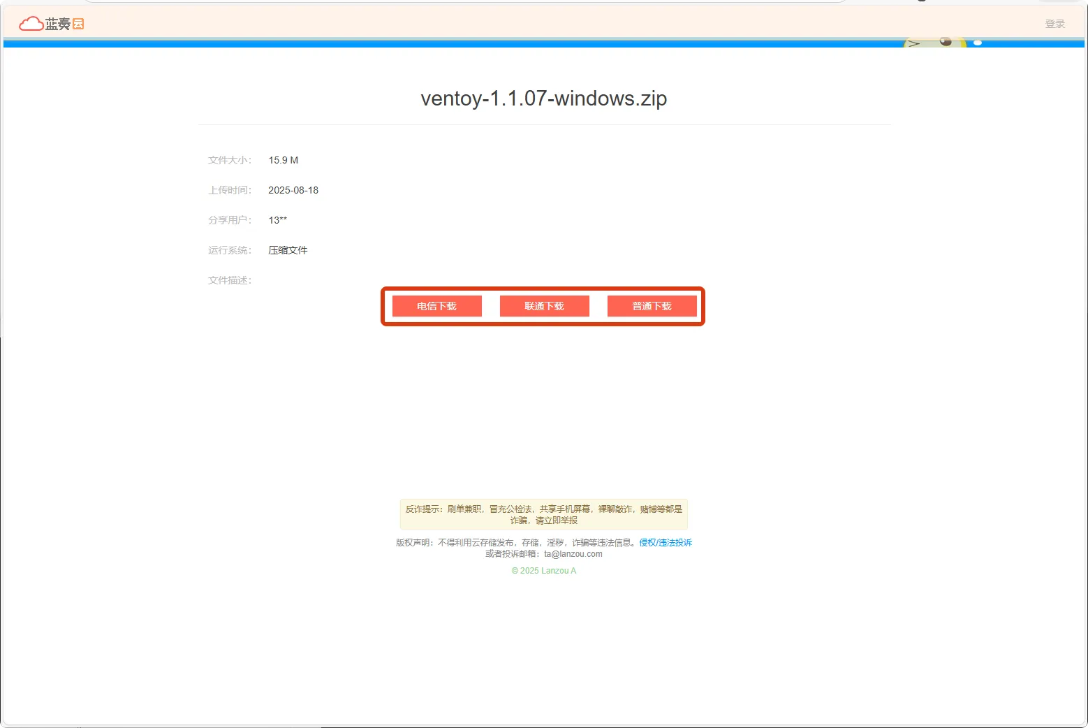 选择”蓝奏云”镜像站点进行下载,该下载渠道对国内用户访问速度较快