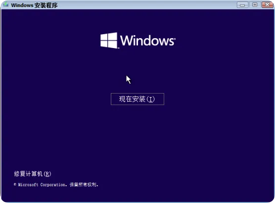 进入Windows安装程序初始界面后,点击”下一页”按钮,然后点击”现在安装”按钮开始系统安装过程