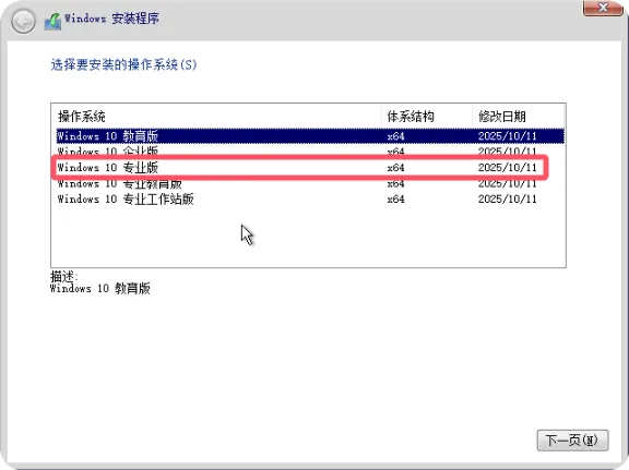 在Windows版本选择界面中,根据您的需求和软件许可选择相应版本。本教程以选择”Windows 10/11 专业版”为例,然后点击”下一页”按钮