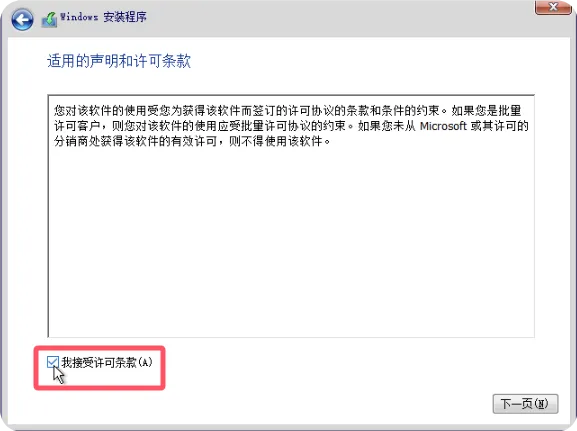 阅读Windows许可条款,勾选”我接受许可条款”复选框,然后点击”下一页”按钮