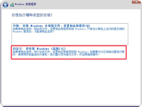 在安装类型选择界面,选择”自定义:仅安装Windows(高级)”选项,此选项适用于全新安装系统