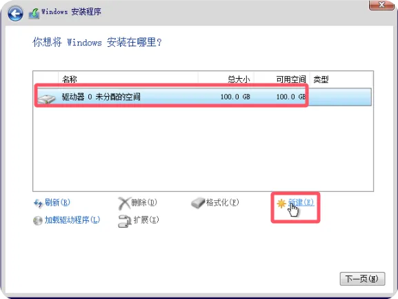 在分区选择界面中,选择您希望安装Windows系统的目标磁盘,然后点击”新建”按钮