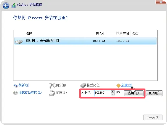 如需进行自定义分区操作,请在分区大小输入框中输入您规划的分区容量(以MB为单位),然后点击”应用”按钮创建分区。对于标准使用场景,建议系统分区容量不小于100GB(Windows 10/11系统占用空间通常在50-70GB左右,预留足够空间用于系统更新和临时文件存储)