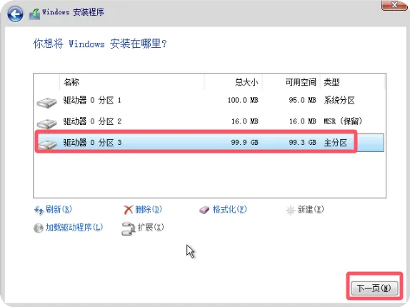 在分区列表中,选择标记为”主要分区”且未分配给其他系统的分区,然后点击”下一页”按钮开始文件复制