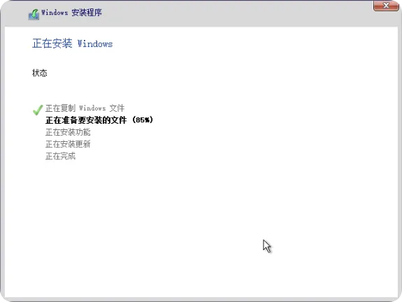 Windows安装程序将开始复制系统文件并准备安装环境。此过程可能需要10-30分钟,具体时间取决于您的硬件配置。系统文件复制和安装准备完成后,计算机将自动重启以继续安装过程