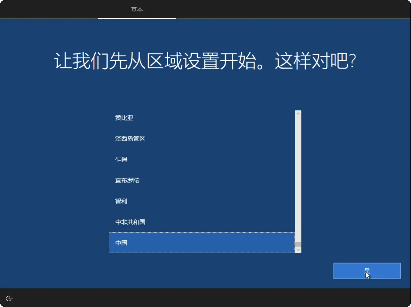 重启后,系统将进入Windows初始化配置页面。首先在地区选择界面中选择”中国”,然后点击”是”按钮