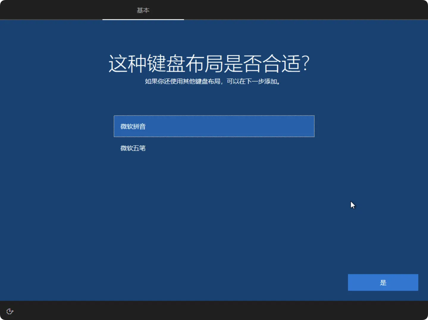 在键盘布局选择界面中,默认选项为”微软拼音”,直接点击”是”按钮继续