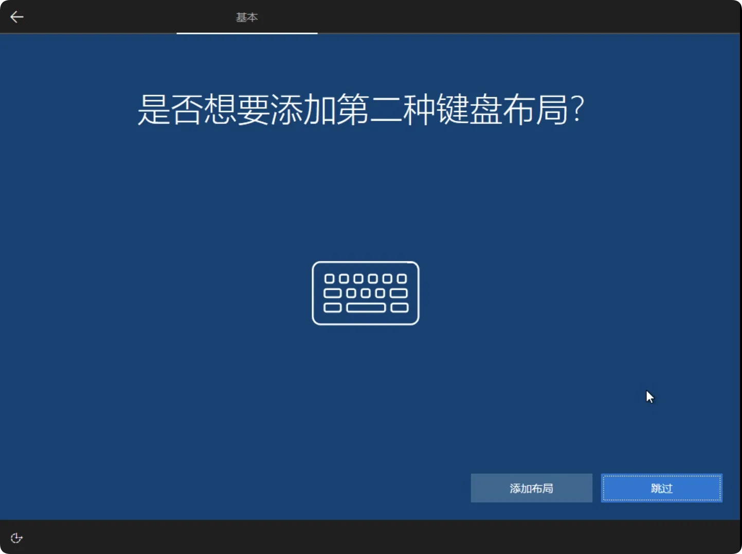 在”添加第二种键盘布局”界面,若您仅需使用一种输入法,点击”跳过”按钮