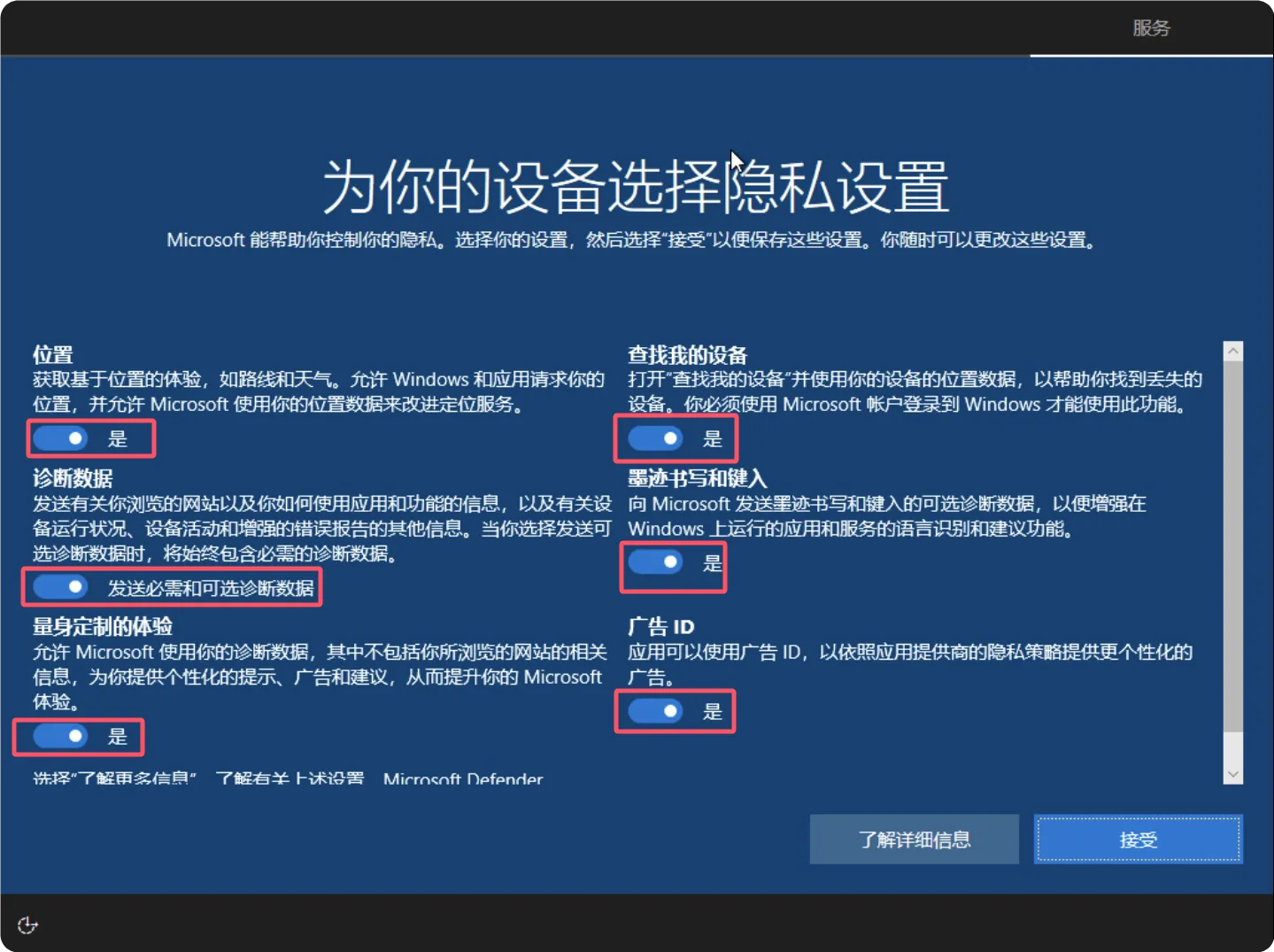 在隐私设置界面,根据您的隐私偏好配置各项隐私选项,完成后点击”接受”按钮